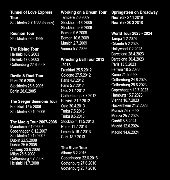 Olkkonen’s concert photo archive consists of tens of thousands of photos taken at nearly 90 Springsteen concerts. Riku gave his photo archive to his wife Nina who spent some time going through the pictures. She selected the best shots for display in a special photo exhibition at the Finlandia Gallery, Helsinki in July 2024. You can find all the exhibition photos and a diverse selection of other great Springsteen concert photos in this book.